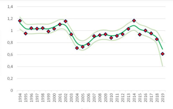 Les plongeurs amateurs et des bénévoles de la Fondation Anemoon très connue dans la protection de la nature aux Pays-Bas ont enregistré de 1994 à 2019 le nombre de homards observés pendant chacune de leurs plongées dans l’Oosterschelde. Le graphique de synthèse illustre clairement la tendance à la baisse que les observations actuelles confirment encore. De 1,2 homard aperçu en moyenne lors d’une plongée en 1994, on passe 0,6 homard en moyenne lors d’une plongée en 2019.