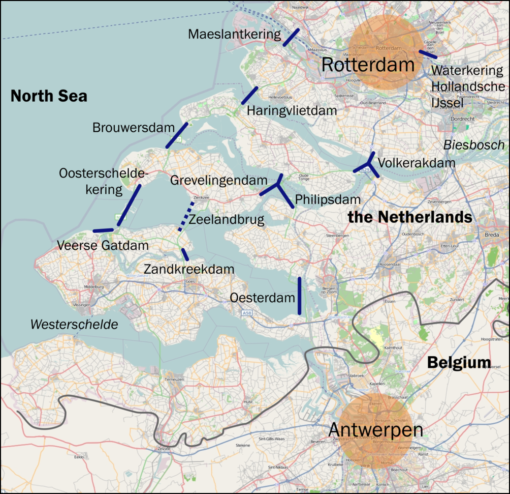 Le delta de Zélande recueille les eaux de trois grands fleuves européens : l’Escaut (360 km de long au travers d’un bassin drainant de 22.000 km²), la Meuse (925 km de long au travers d’un bassin drainant de 36.000 km²) et le Rhin (1.235 km de long au travers d’un bassin drainant de 185.000 km²). Au long de leurs 2.500 km cumulés, ces trois fleuves traversent des villes, des régions agricoles et des régions industrialisées couvrant plus de 240.000 km² exposées à de multiples pollutions.