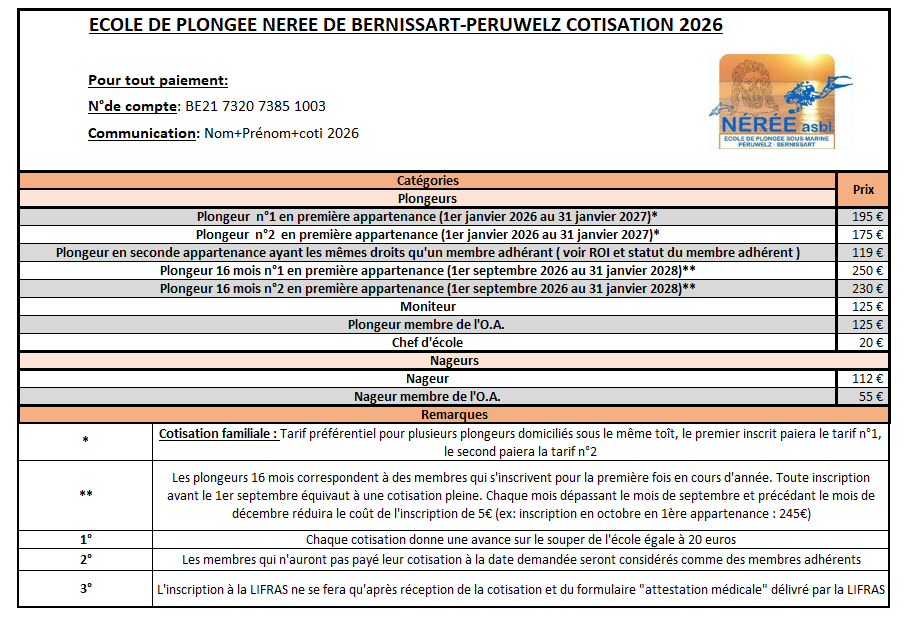 - le paiement de votre cotisation : Celle-ci nous permettra de couvrir vos frais d’assurance auprès de la Ligue Francophone d’Activités Subaquatiques (LIFRAS), l’accès à la piscine pour toute l’année ainsi qu’une avance de 20€ sur le souper annuel du club.